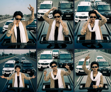 ULTRA-REALISTIC 8K PORTRAIT OF A STYLISH YOUNG MAN [KEEP IT REAL FACE FROM UPLOADED IMAGE]SUBJECT: A 17 YEAR OLD YOUNG MAN WITH VOLUMINOUS, MESSY DARK WAVY HAIR AND A CLEAN TAPER FADE ON THE SIDES AND THE BACK OF THE HAIR IS LONG AND FLOWS DOWN TO THE NAPE OF THE NECK. HE IS WEARING A TAN CORDUROY SHIRT-JACKET (SHACKET) OVER A BLACK GANJI WITH DRAPPED WHITE GAMCHA AROUND HIS NECK AND SHOULDER, THIN SILVER CHAIN, THICK KADA ON HIS WRIST, DARK RECTANGLE SUNGLASSES AND STANDING THROUGH THE SUN ROOF OF A FULLY BLACK DEFENDER, GESTURING CONFIDANTLY HIGH TOWARDS THE SKY AND LOOKING AT THE CAMERA WHILE HOLDING A SILVER COLOUR IPHONE 27 PRO MAX TO HIS EAR IN A CANDID POSE.VEHICLES: A CONVOY OF PREMIUM SUVS, INCLUDING A WHITE MAHINDRA SCORPIO-N (LEFT) AND A BLACK MAHINDRA SCORPIO-N (RIGHT). OTHER CARS FOLLOW BEHIND IN A MULTI-LANE FORMATION.”arms-wide-open” pose or the “open arms” pose.quality, 8k. The lighting style is direct camera flash photography, giving it a raw, urban, and slight retro film aesthetic stylish pose, cinematic depth of field, 8k resolution, shot on 35mm lens. –ar 3:4